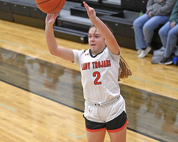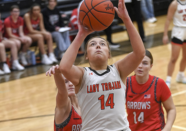 ARCANUM – The Lady Trojans bolted out to a 25-5 first quarter, and a 44-12 first half lead as they were firing from all over against visiting Preble Shawnee. Arcanum went on to win 65-21.