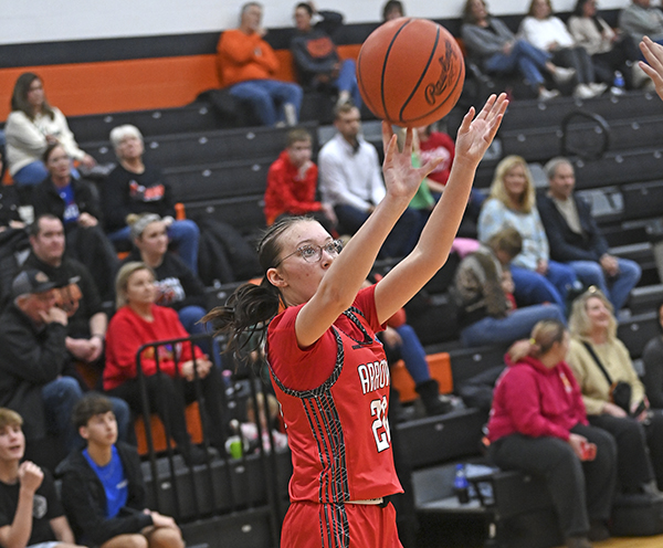 Adalyn Paul didn't let the hair in her eyes stop her from shooting from distance. The junior guard had 6 triples for 18 points in the game for Arcanum.