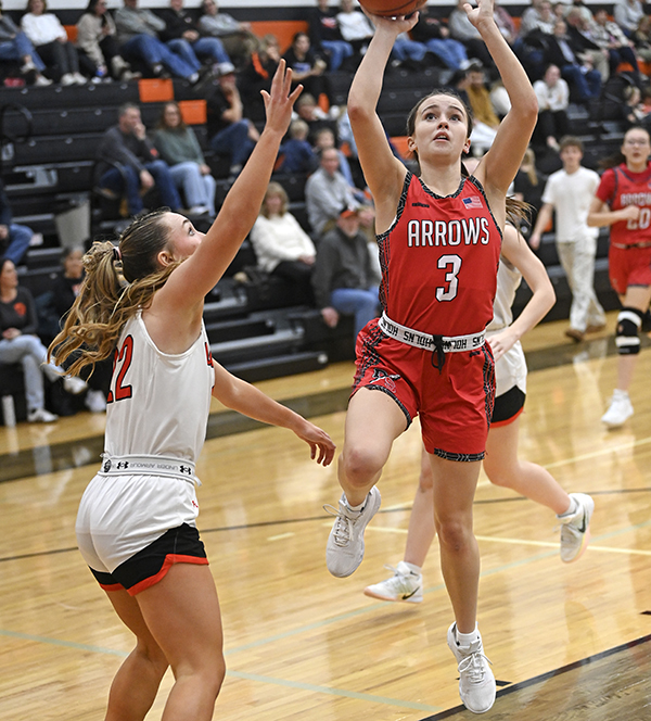 Senior Aubrey Unger goes hard to the basket. She is called on handling the ball and leading the defense and gives the Arrows an athletic guard who can make plays.