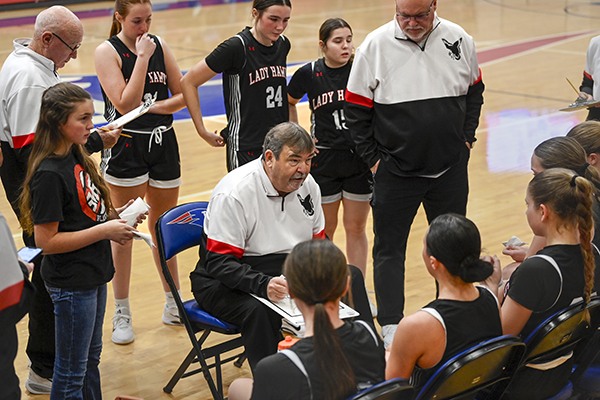 Mississinawa Coach Kirk Comer makes adjustments during game with Tri-Village. The Blackhawks won the key early season WOAC game 65-38. (Dale Barger photo)