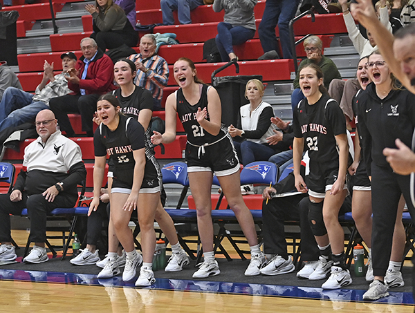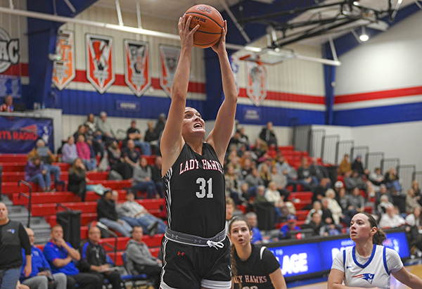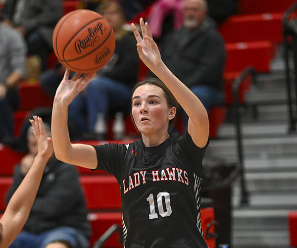 Senior Makenna Hoggatt had the hot hand early knocking down three triples in the opening quarter to give the Hawks a 17-5 lead. (Dale Barger photo)