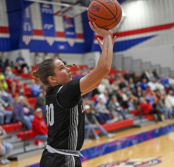 Senior Ava Figel shoots jump shot beyond arch in game with FM. (Dale Barger photo)