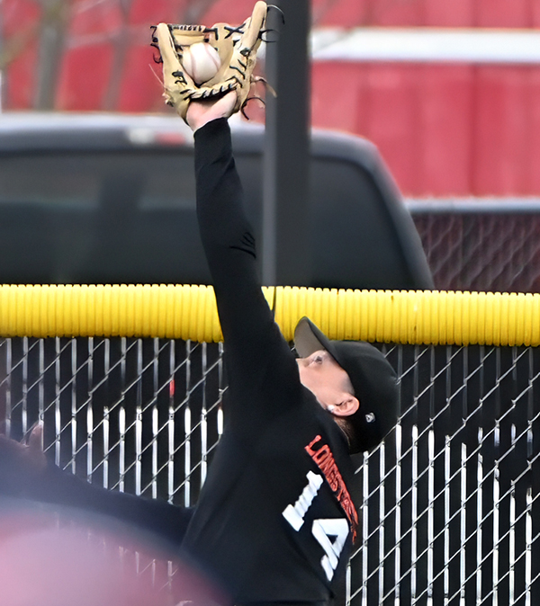 Derek Longstreth makes an over shoulder catch running at center field fence. In baseball one or two plays can make all the difference & this was a big play.