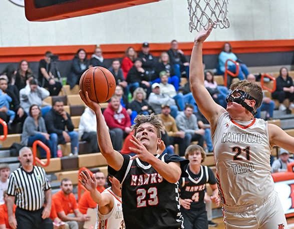 Mississinawa Valley Jr. Cing Scott rises above the defender for a short corner jumper. The Hawks beat National Trail 47-37 in WOAC action. (All photos by Dale Barger)