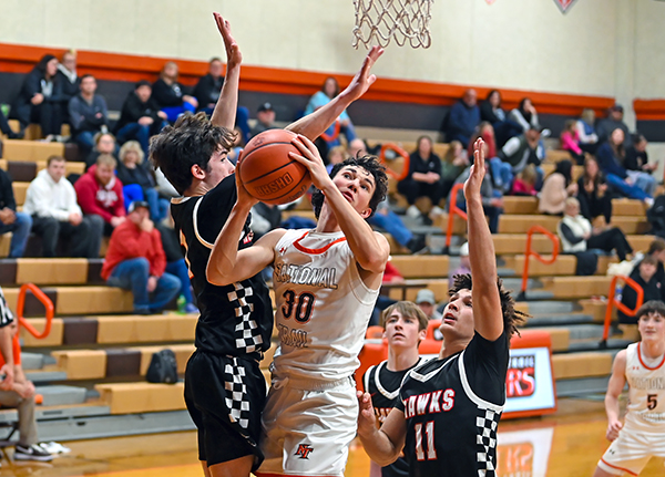 Arcanum senior Cameron Ball operates well around the basket but was slowed down by the presence of Dorrel and Foxbower on this night. Ball ended the game with 6 below his 10 point average.