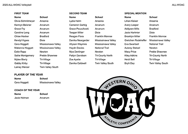 ARCANUM - The Western Ohio Athletic Conference announces their all-conference teams and final league standings. The Arcanum Volleyball team would go undefeated and win their third straight conference championship.