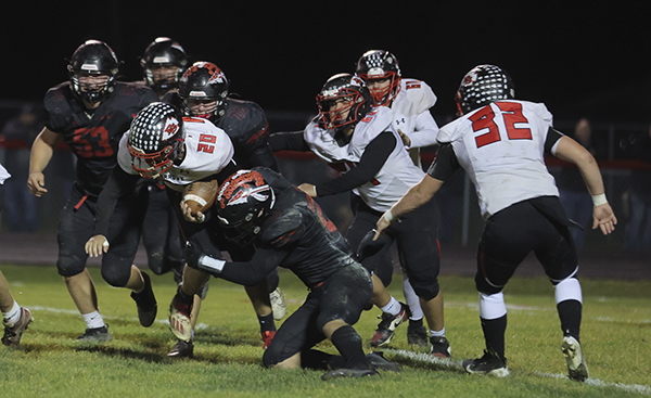 Soph running back Ethan Mauller fights for yards in playoff game at Indian Lake.