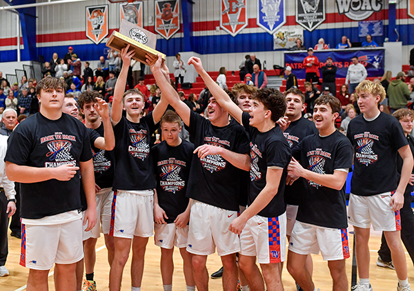 The Tri-Village boys basketball team by way of a 55-20 win over Preble Shawnee claims the 2026 WOAC championship trophy.