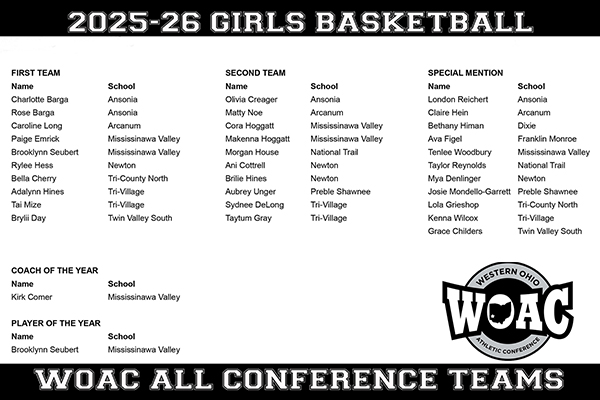 CAMDEN – The Mississinawa Valley girls basketball team wrapped up a perfect 10-0 record in the Western Ohio Athletic Conference after a 65-35 win at Preble Shawnee to claim an outright 2025-26 League Championship.