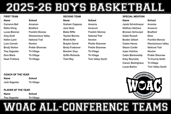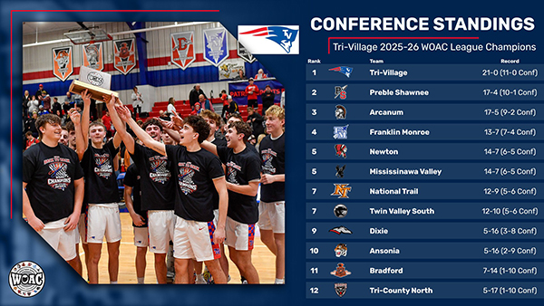 Since the inception of the 12 team Western Ohio Athletic Conference there has only been two boys basketball teams win a league championship. Tri-Village won the initial season 2021-22 and in 2024-25. Preble Shawnee sandwiched in between back-to-back titles in 2022-23 and 2023-24.