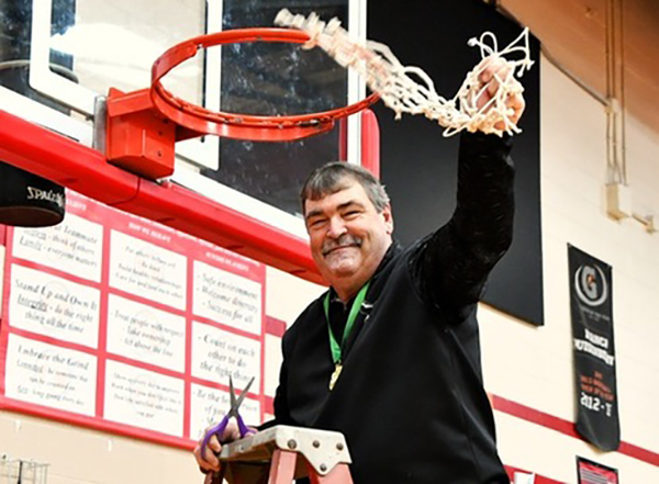 Mississinawa Valley Lady Blackhawks coach Kirk Comer, the 2025-2026 WOAC Coach of the Year, cuts down the net in the District Championship win over Middletown Christian.