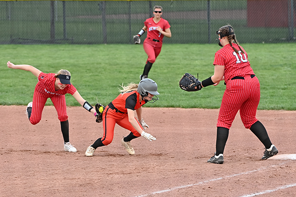 Freshman 2nd baseball Tylea Jackson chases down Grace Fry tagging her out in a run down.