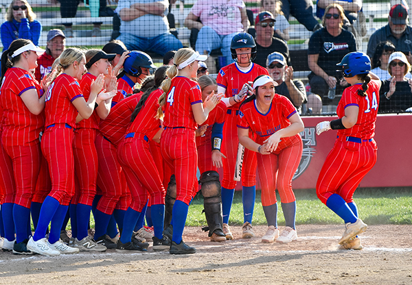 Tri-Village's Caley McCarroll is greeted at the plate from her team as the Patriots out hit Tri-County North in softball action for an 11-3 win.