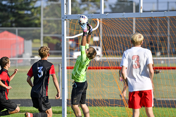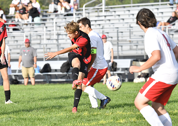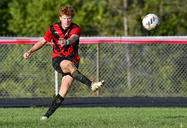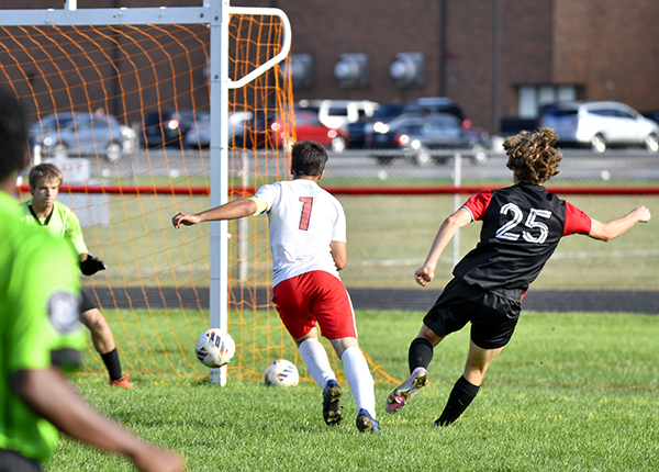 Senior Ethan Fields (#25) squeezed the ball in just past the corner post and the goalie to score in a 7-0 win over Twin Valley South. (Barger photo)