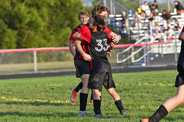 Kyle Bruno was ecstatic to get a start in the game and happy after scoring his first career goal, gives a hug to Ethan Fields who gave him an assist on the play. (Barger Photo)