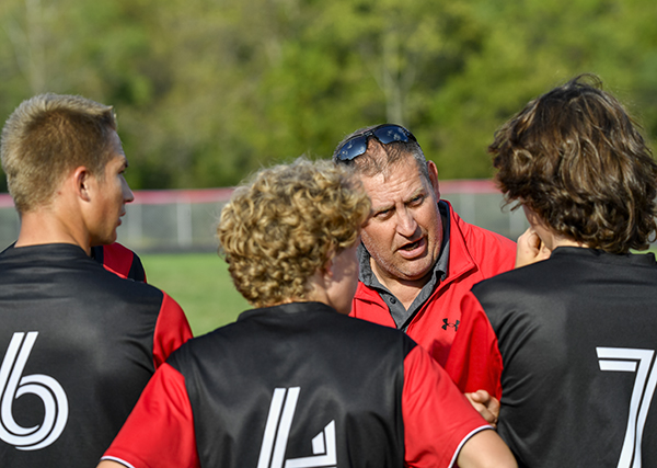 Coach Jason Lucy instructs his team and after 10 years he got to celebrate with them the first boys soccer league championship. (Barger Photo)