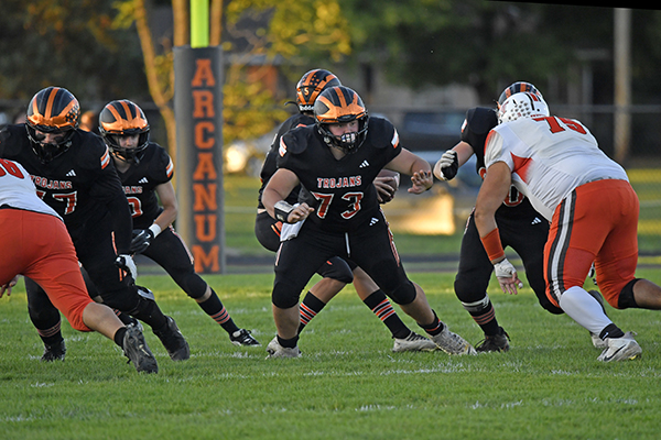 Arcanum's offensive line opened up some big holes for their running backs and drew praise from Coach Matt Macy on their plays in win over National Trail. (Dale Barger photo)