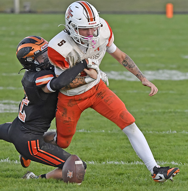 Arcanum's Ross Wagner stripped the football to stop a good drive by the Blazers. The ball was recovered by Paxton Besecker. (Dale Barger photo)