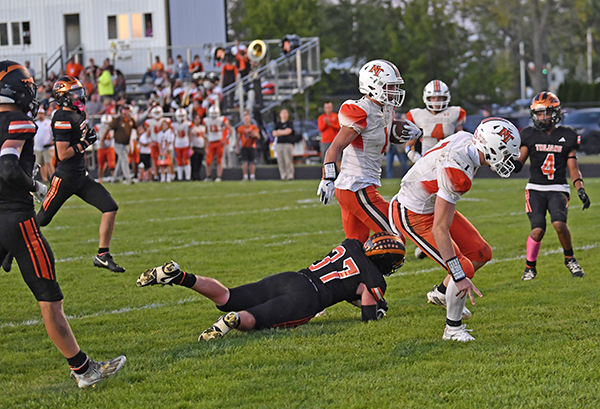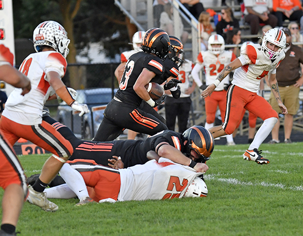 Hudson Knaus gets dragged down from behind.  He scored two TD's in the game on runs of 55 and four-yards. (Dale Barger photo)
