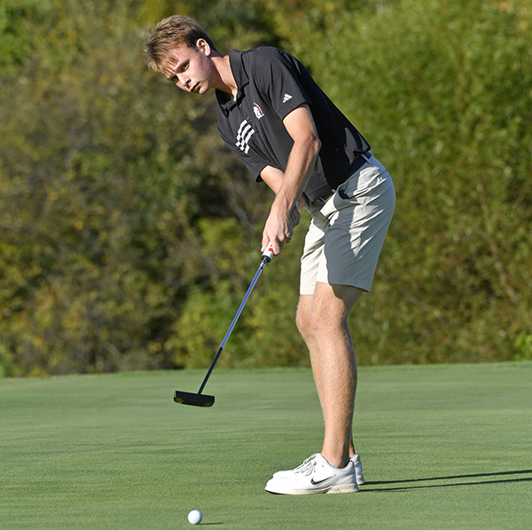 Arcanum's Luke Stephens eyes a putt that he would make to win a playoff to qualify for the DII Boys Golf State Tournament. (Dale Barger photo)