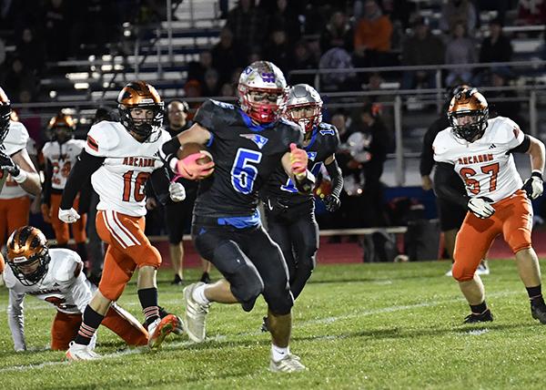 Tri-Village stopped Arcanum on their first possession, and it didn’t take long for them to put the first points on the board with senior Noah Finkbine breaking a couple of tackles and going 52 yards to go up 7-0 at 6:03 in first quarter.