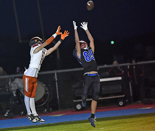 Sophomore defensive back Aaron Bruner goes up high for one of two interceptions and both stopped Arcanum drives near the goal line. (Dale Barger photo)
