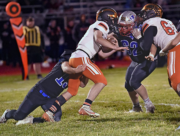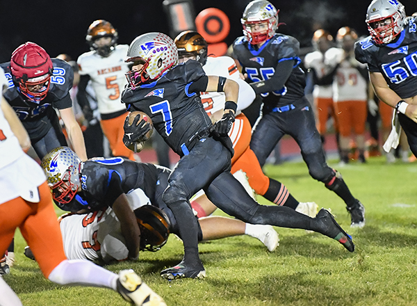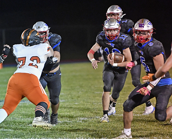 Tri-Village senior Noah Finkbine rumbled for two first quarter TDs. He had 150-yards on 9 carries in the game. (Dale Barger photo)