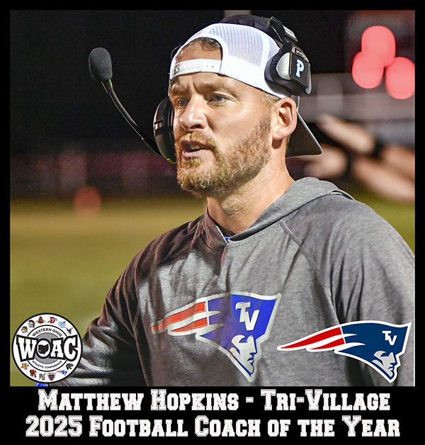 Tri-Village football coach Matthew Hopkins helped lead the Patriots to their first perfect season at 10-0 and 9-0 in the WOAC to win an outright league championship in 2025.