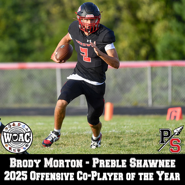 Preble Shawnee senior quarterback Brody Morton was second in the league in both passing and rushing. He threw for 1239 yards and 15 TDs. He rushed for 1,150 yards and 22 TDs. He accounted for 2,389 total yards of offense and 37 touchdowns.