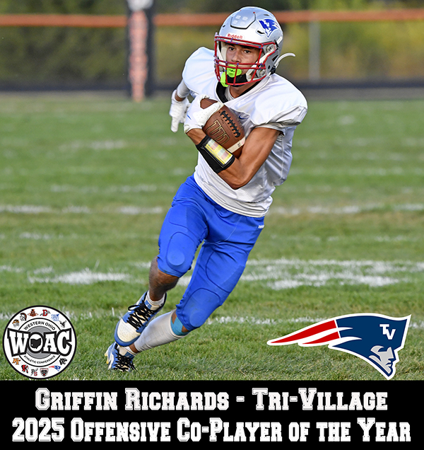 Tri-Village junior receiver Griffin Richards led the league in receptions (45) and yards received 1036 with 18 TDs.