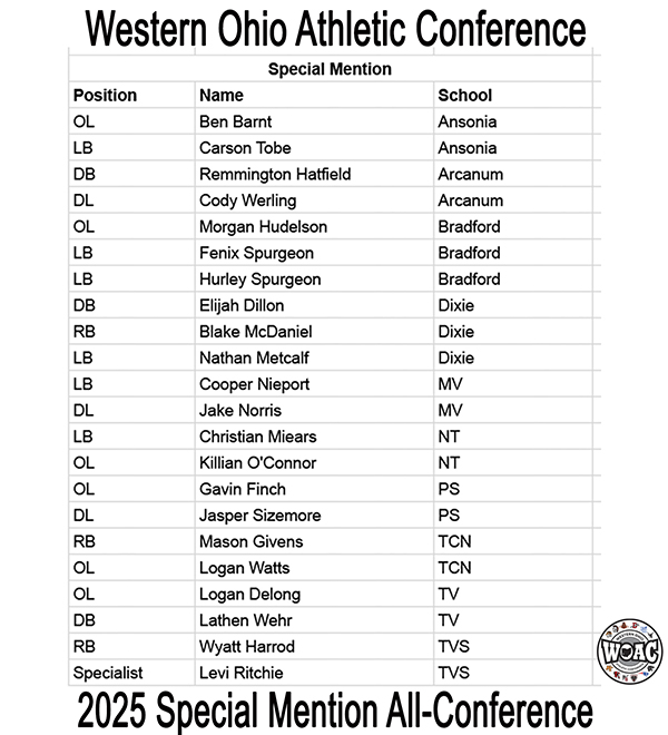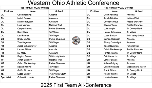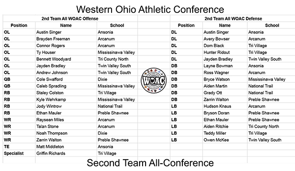 Congratulation to all the players earning all-conference honors and best of luck to Ansonia, Arcanum, Preble Shawnee and Tri-Village in the football playoffs