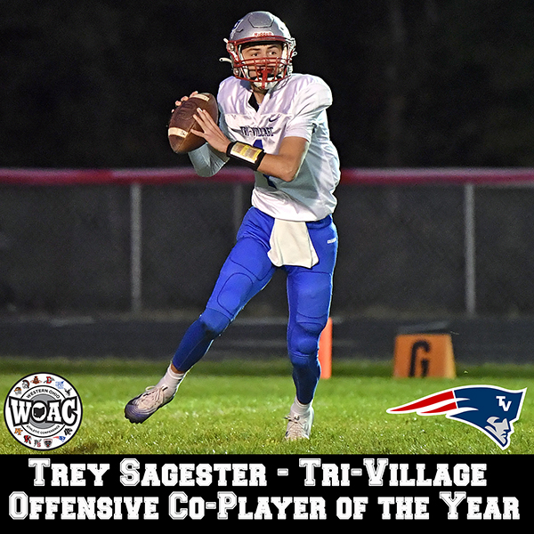Tri-Village senior quarterback Trey Sagester who threw over half of his 2,000 yards this season and 30 TDs to Griffin Richards, also rushed for 295 yards and had 5 TD's on the ground to lead the Patriots with 35 TDs and a perfect season.