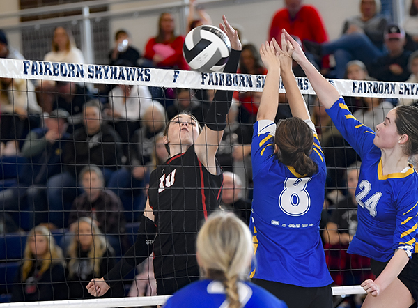 Mississinawa trailing 11-8 fought back to 12-11 behind the serving of Ella Godfrey. The Lions continued to battle and incremental increased their lead back to three, 17-14. Mississinawa finally started to get back in the groove on offense with senior setter Danika Neargarder setting them back in sync with big swings from Cora Hoggatt and Allyson Waymire, but the Hawks still trailed 21-19.